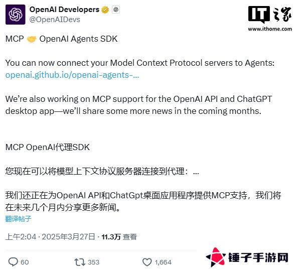 本站 3 月 27 日消息,今日凌晨,OpenAI 宣布对其 Agent SDK 进行重大更新,正式支持 Model Context Protocol(MCP)服务。