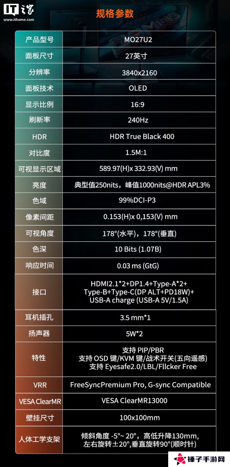 这款显示器配备一块27英寸 3840x2160分辨率 240Hz QD-OLED面板,显示器动态对比度150 万:1,典型亮度250尼特,峰值亮度1000尼特,显示器 GtG响应速度0.03ms,支持10-Bit色彩,覆盖99% DCI-P3色域。