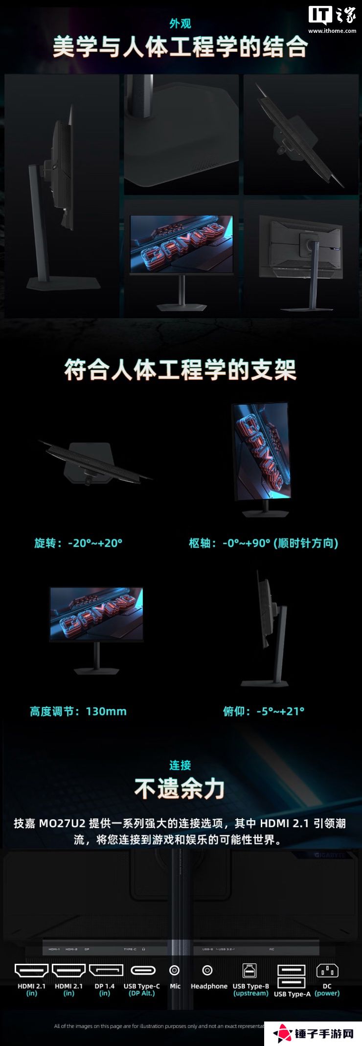这款显示器支架支持倾斜 / 升降 / 旋转,显示器本体配备2个 5W扬声器,同时支持VESA 100x100mm壁挂,提供2个 HDMI 2.1接口、1个 DP 1.4接口、1个 USB-C 18W接口、1个 USB-B 3.2接口(KVM)、2个 USB-A 3.2接口(KVM)。