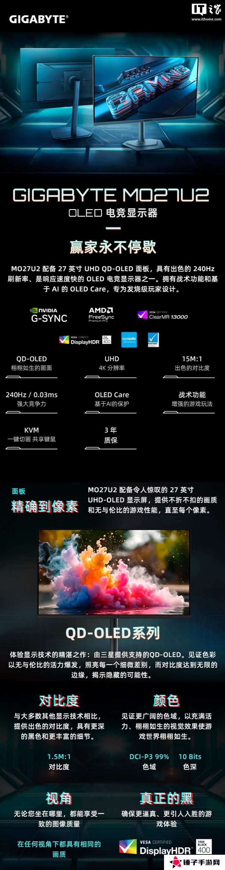 技嘉“MO27U2”27 英寸显示器开售:4K 240Hz QD-OLED + 双 5W 扬声器,5489 元