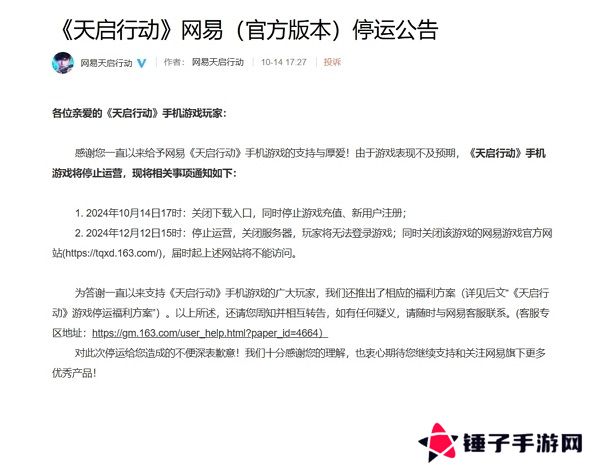 2024年10月14日17时,游戏将关闭下载入口,同时停止游戏充值、新用户注册
