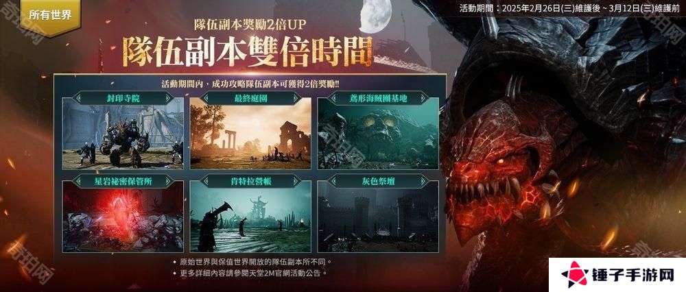 全服务器【队伍副本双倍时间】:2/26 维护后~3/5 维护前,活动期间内,完成队伍副本时可以获得 2 倍最终奖励「首领秘密箱」。
