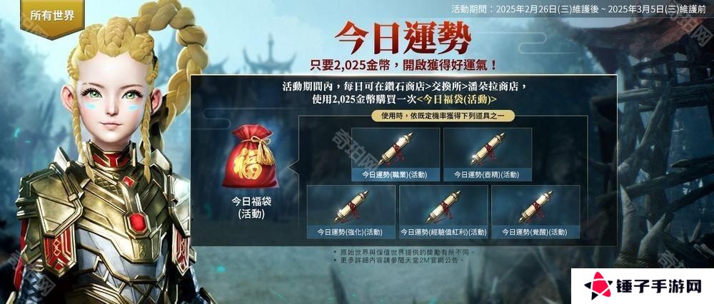 所有世界【今日运势】:2/26 维护后~3/5 维护前,活动期间内,每日可在钻石商店→交换所→潘朵拉商店,使用 2,025 金币购买一次「今日福袋 (活动)」;使用时,依既定机率获得下述道具之一: