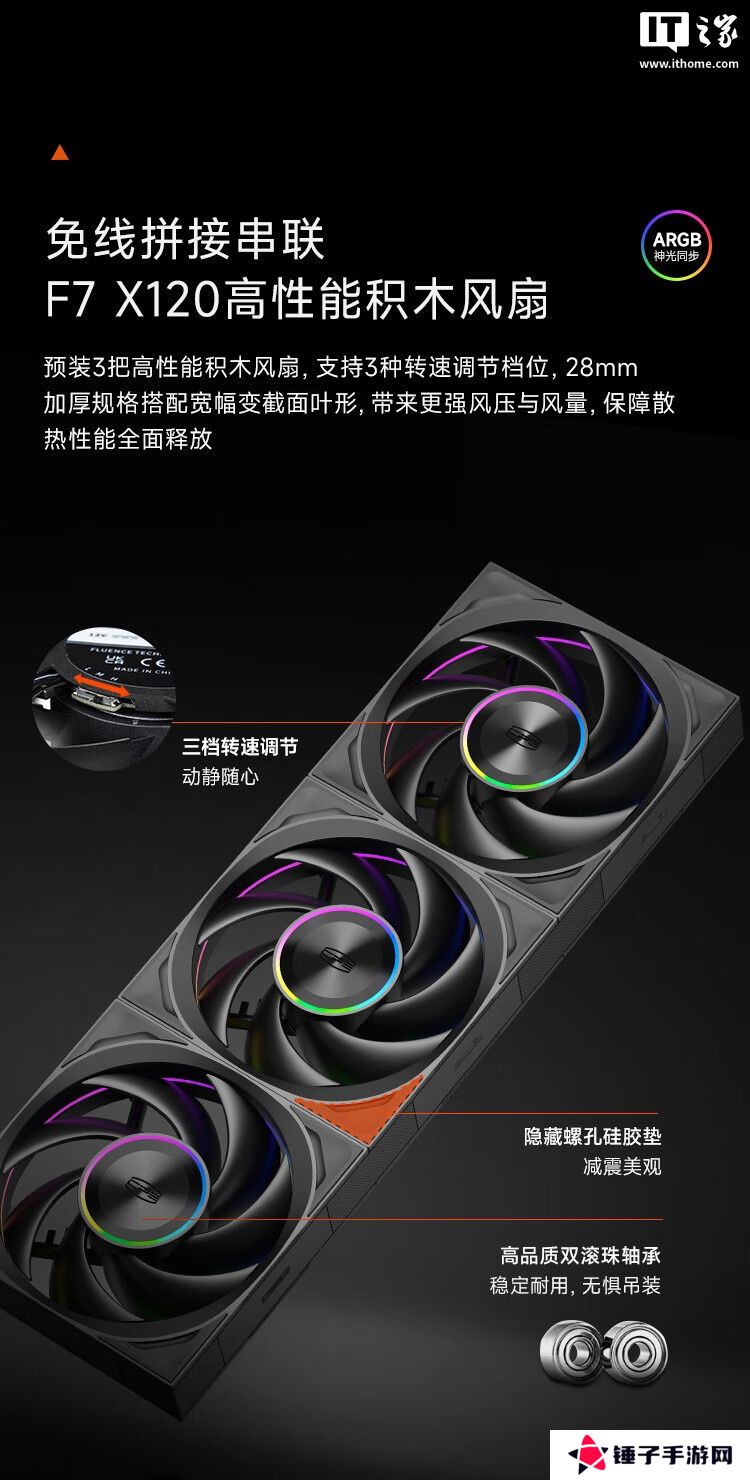 此外其标配三颗光翼 F7 X120 风扇,各扇体间采用积木拼接 + 卡扣固定的免线串联结构。该风扇采用 12028 加厚规格,搭载双滚珠轴承,支持三档转速调节(3000 / 2200 / 1500 RPM)。