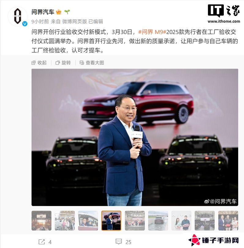 本站 3 月 30 日消息,本站从问界汽车官方获悉,2025 款问界 M9 先行者今日在赛力斯工厂验收交付,此次交付采用“认可才提车”的方式,让用户参与自己车辆的工厂终检验收。