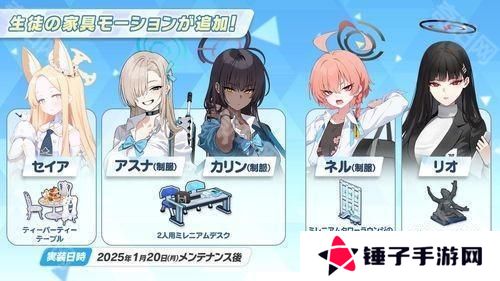 随着新学生的登场,游戏内的咖啡厅将实装全新家具系列「千年塔休息室」,以及本次登场 5 位新学生的互动家具。