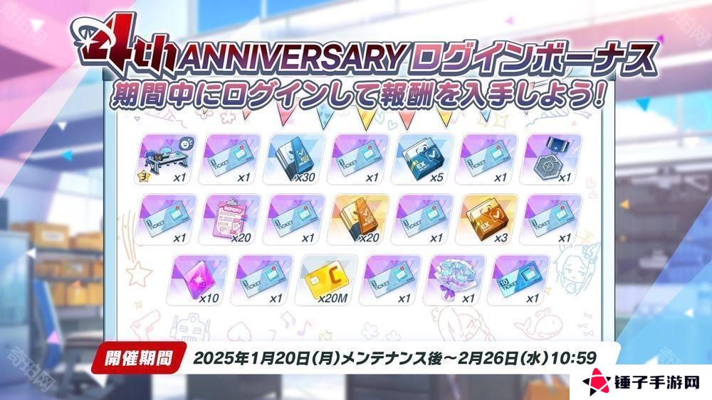 纪念 4 周年的登入奖励也自今日维护后至 2 月 26 日(三)期间内登场,首日的奖励为可与明日奈(制服)、花凛(制服)互动的家具「2 人用千年科学学园课桌椅」。