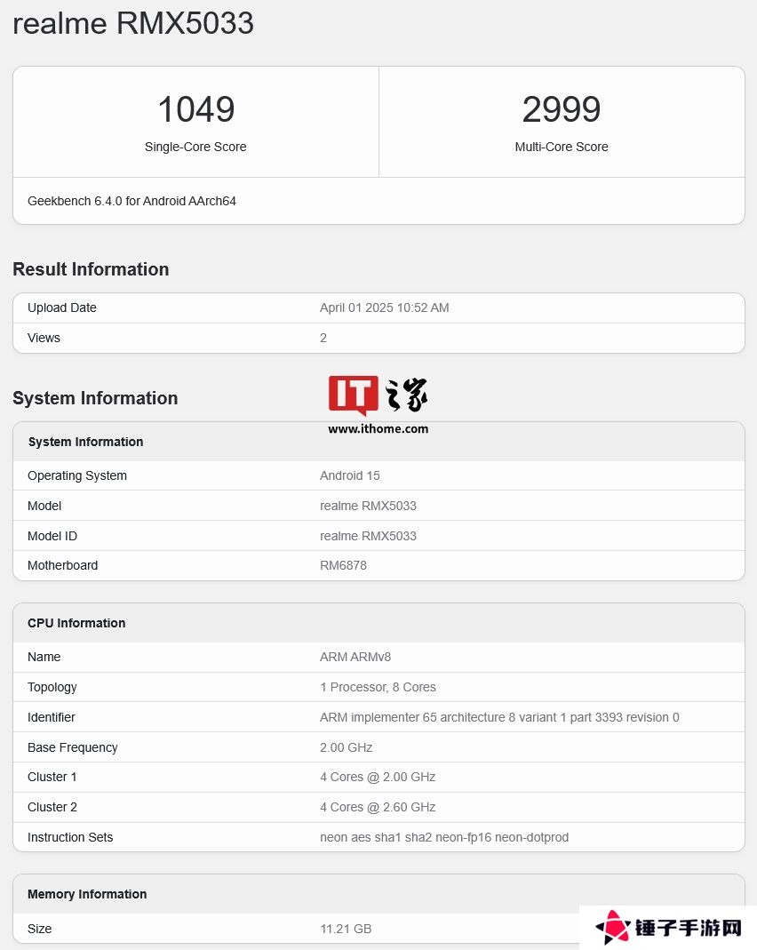 本站 4 月 2 日消息,科技媒体 xpertpick 昨日(4 月 1 日)发布博文,报道称 realme 真我 Narzo 80 Pro 手机(型号 RMX5033)现身 Geekbench 跑分平台,确认搭载联发科天玑 7400 芯片,单核 / 多核得分分别为 1049/2999,配备 12GB 内存与安卓15 系统。