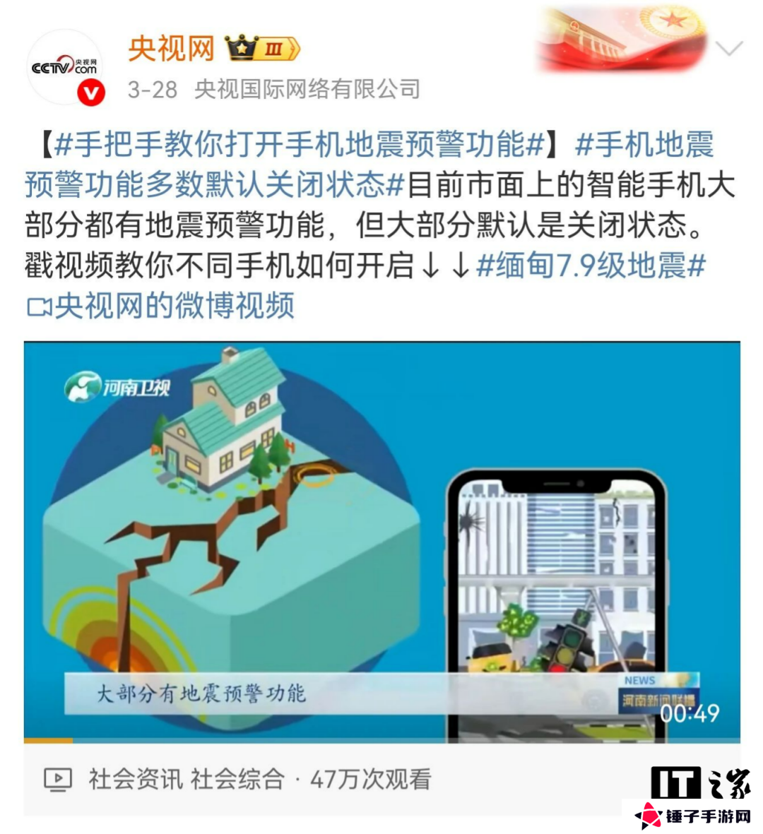 对此在昨天(3 月 29 日),网友们针对“预警”在社交媒体上展开了讨论,央视网援引河南卫视视频表示目前市面上的大部分智能手机都内置地震预警功能,但有的是默认关闭状态。