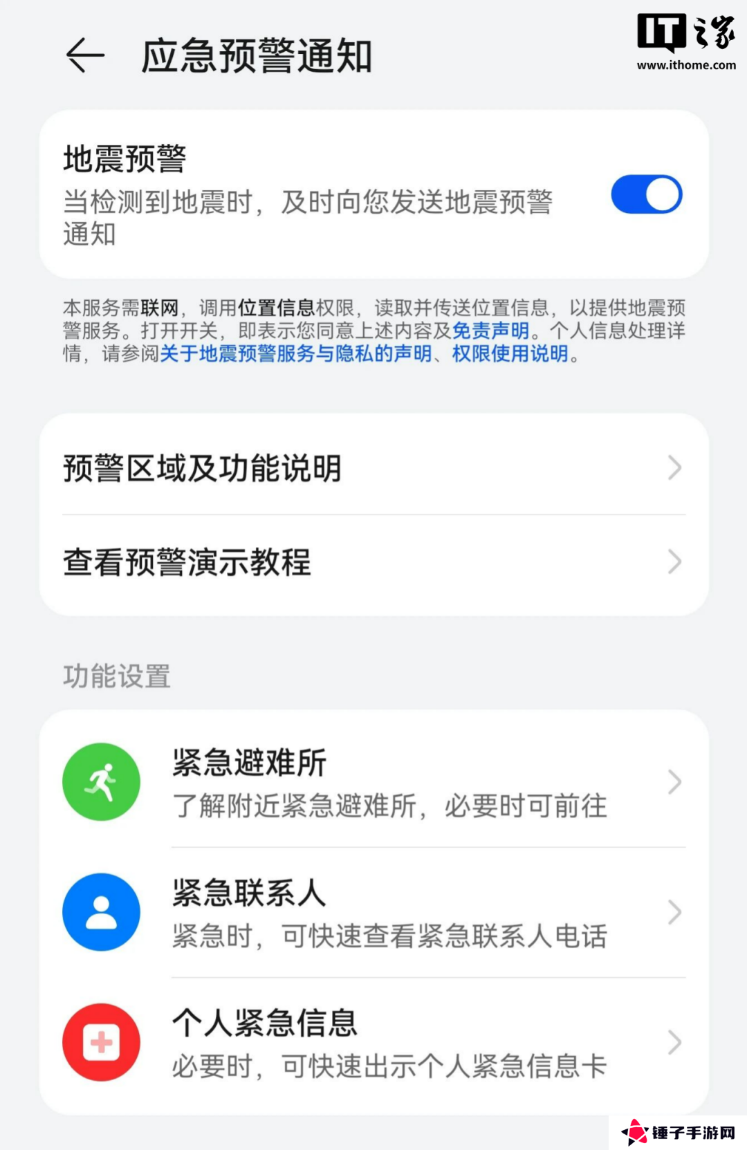 荣耀:设置- 安全 -应急预警通知 - 地震预警;