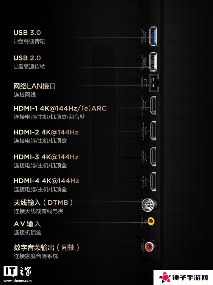 接口方面,系列电视提供4个 HDMI 2.1接口、1个 USB-A 3.0接口、1个 USB-A 2.0接口、天线输入接口、AV输入接口、数字音频输出接口。