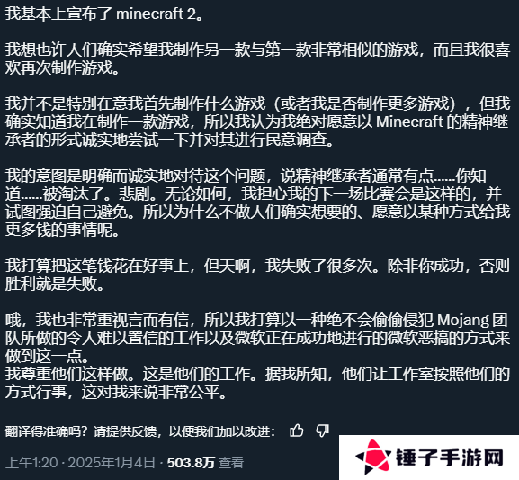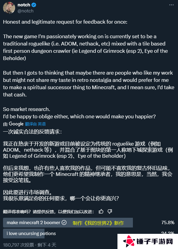 消息的源头来自“notch”于1月2日在X平台上发布的一条动态。他在该动态中表示,自己正着手开发一款全新的游戏。起初,他考虑的是制作一款传统的地下城探索类肉鸽游戏。但鉴于广大玩家对《我的世界2》的期待之声愈发高涨,他决定向玩家们征集意见,再做定夺。