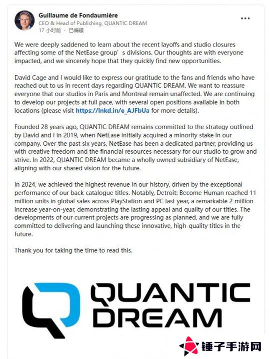 在最近的领英帖子中,量子梦工作室的首席执行官和发行主管Guillaume de Fondaumière谈到了他们目前的状况,他对网易旗下某些工作室关闭和裁员深感悲痛,但量子梦工作室旗下的两个分支机构:巴黎办事处和蒙特利尔办事处,都不会受到任何不利影响,他们的项目正在全速推进中,甚至最近还在招聘新员工。