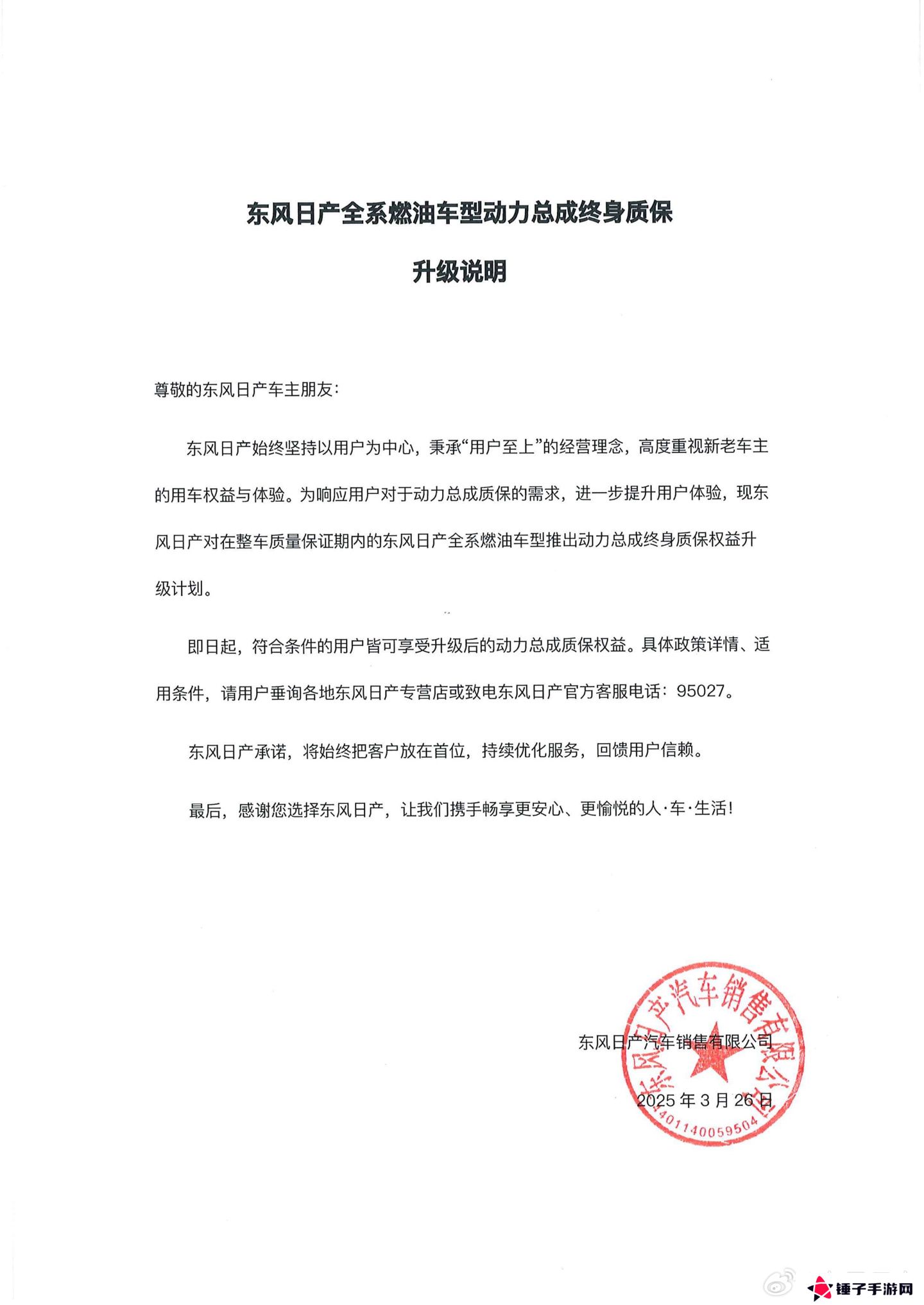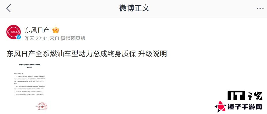 本站 3 月 27 日消息,东风日产官方微博昨日晚发布升级说明,宣布东风日产全系燃油车型动力总成升级终身质保。
