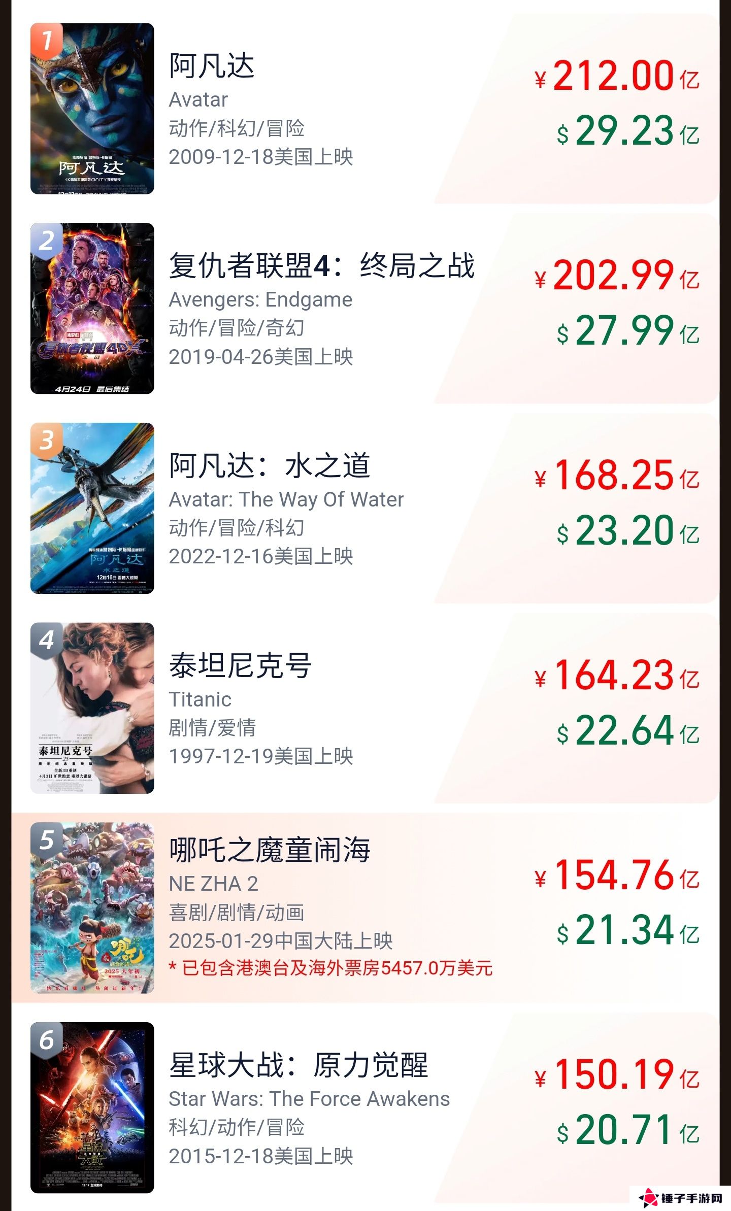 这部春节档影片于今年 1 月 29 日上映,目前全球票房已经达到了 154.76 亿,暂列影史第五。排在该影片前面的是 1997 年上映的《泰坦尼克号》,其票房为 164.23 亿。而《哪吒之魔童闹海》将延长上映至 4 月 30 日,也就是说还有大概一个月的追赶时间。