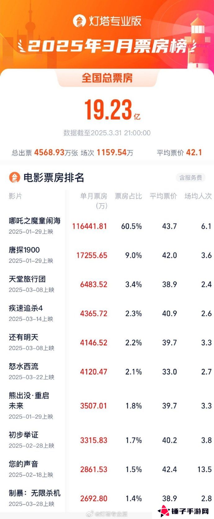 本站 3 月 31 日消息,据灯塔专业版数据,截至 3 月 31 日 21 时,2025 年 3 月票房 19.23 亿,《哪吒之魔童闹海》成为 3 月票房冠军,同时连续 3 个月获得月度票房冠军。