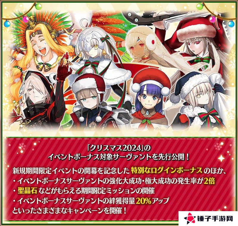 面对即将自 12 月 11日举办期间限定活动「圣诞节 2024」,率先在期间内 12 月 4 日~12 月 18 日实施举办前预热活动,内容包含了特别登入次数登入奖励、期间限定任务、活动加成从者 犟化大成功・极大成功 2 倍&羁绊获得量提升 20%。