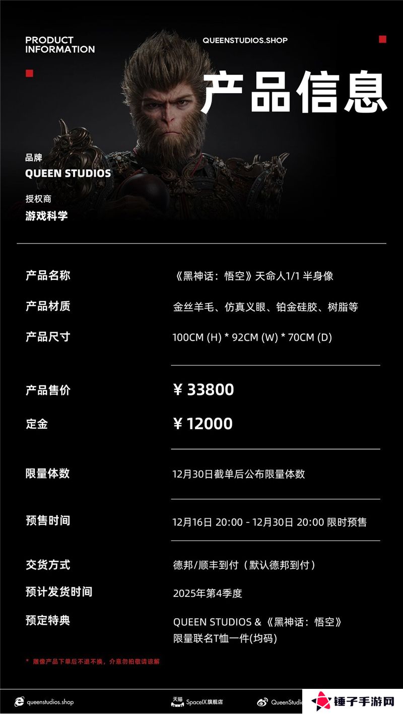 黑神话悟空主角天命人1:1半身立像的售价为33800元,定金为12000元。