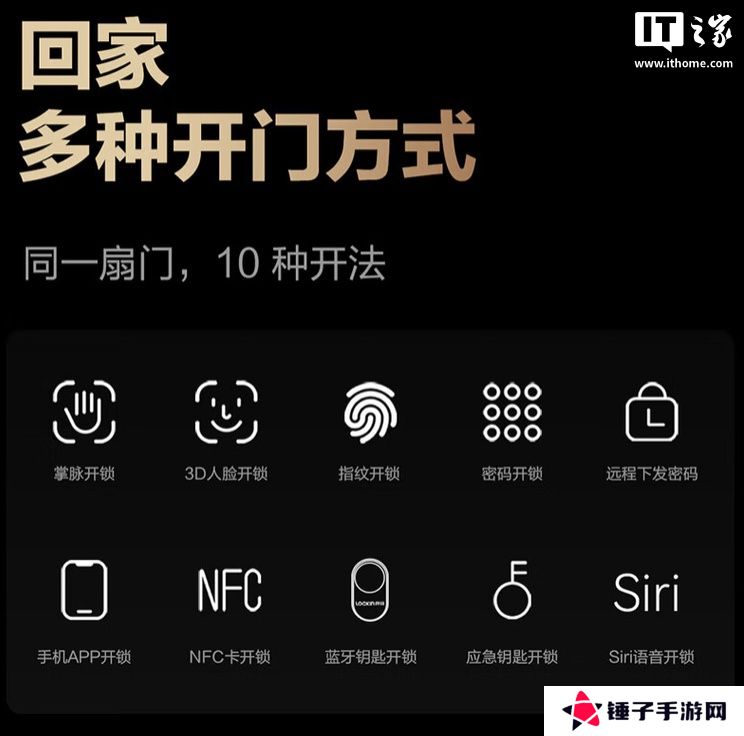 该门锁应用了多眸掌静脉识别技术,同时配备结构光3D解锁,其他方面还支持指纹开锁、密码开锁、手机App开锁、NFC卡开锁、蓝牙钥匙开锁、Siri语音开锁、应急钥匙开锁。