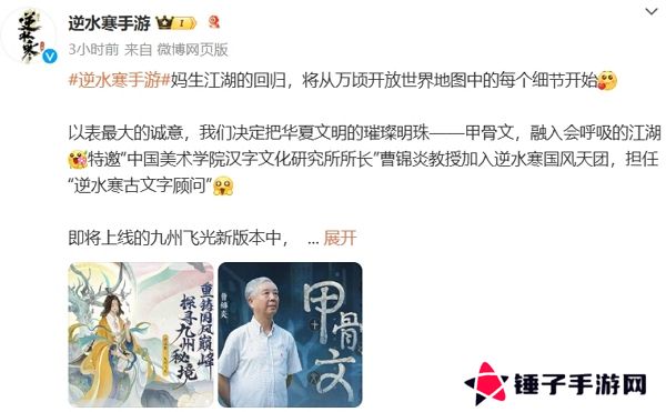 与此同时,逆水寒手游还特邀“中国美术学院汉字文化研究所所长”曹锦炎教授加入逆水寒国风天团,担任“逆水寒古文字顾问”。