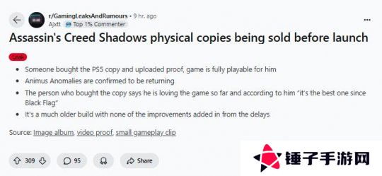 不过目前除了在相关论坛等第三方社交媒体和社区中有着《刺客信条:影》偷跑的消息外,并未有具体的视频截图等内容出现(有PS5实体版游戏出售相关链接,显示为已售出)。