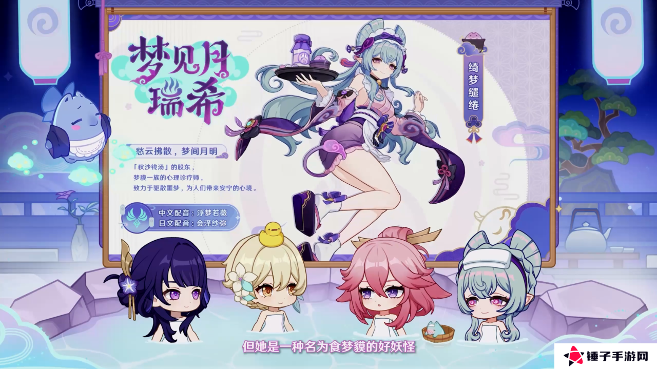 5星风元素法器角色,来着稻妻的食梦貘。她的元素战技可以悬浮于地面上并且间歇性对附近敌人造成风元素范围伤害。大招可以牵引敌人,并且可以持续造成风元素伤害或者回复生命值,对于扩散反应有增益效果。