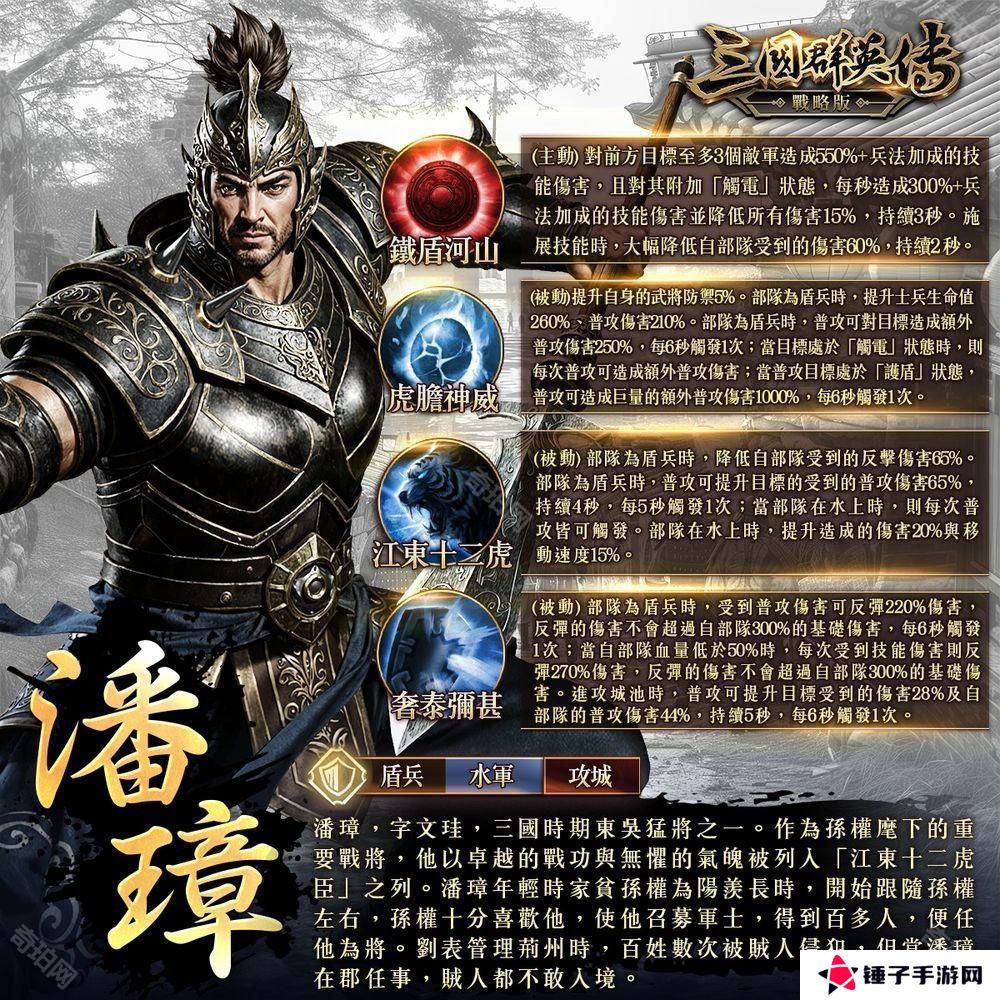 与程普、黄盖、韩当等人并列「江东十二虎臣」的传奇人物 –「潘璋」即将震撼登场!潘璋为虎胆神威的象征,作为孙权麾下的一员猛将,他屡立战功,尤其在水战中展现出绝对的实力,令人叹服。在《三国群英传 - 战略版》中,潘璋作为普攻的强者,具备快速破盾、反弹伤害及水上优势,他的现身将为**增添锐不可挡的攻势!