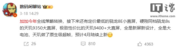 该博主此前爆料,一加今年全线策略转换,接下来还有“定价最低”的骁龙 8 至尊版小直屏。新机全是新屏新设计,全是大电池,天玑做了原生级超帧,预计 4 月陆续上新。