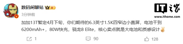 本站 3 月 26 日消息,博主@数码闲聊站 今日爆料,一加 13T 手机暂定 4 月下旬发布,核心卖点就是大电池和质感设计。