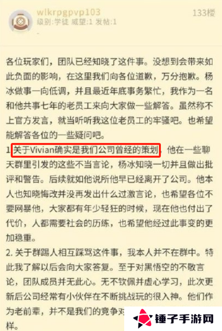 关于这名叫Vivian的员工是否为《失落之魂》的开发者,现阶段依然扑朔迷离。在主创杨冰的道歉声明中,只是提到他是团队的前员工。但在此前NGA的网友爆料中,却称此人曾是游戏策划。