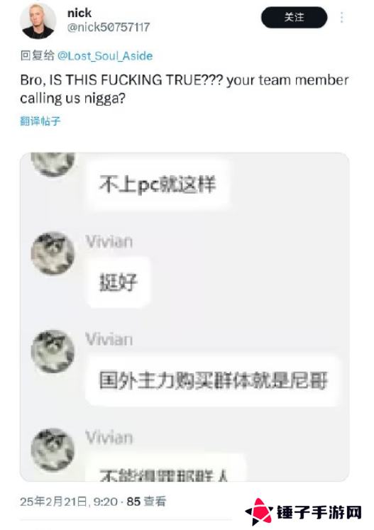 但无论Vivian的具体身份是什么,这些言论都已经对《失落之魂》的对外风评造成了影响。即便他的语境中不乏对国外市场的讨好之意,但歧视性的用语却已经招致了国外玩家的反感。在X上,国外玩家对于被中国游戏开发团队员工喊“Nigga”这件事展开了争论。
