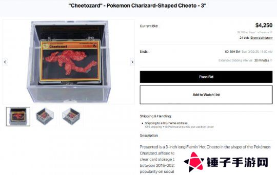 这款薯片为火辣味奇多薯片,颜色火红、形状神似喷火龙。在拍卖网站Goldin上,许多《宝可梦》玩家竞相报价,最终竞拍价格已超过4000美元(约合人民币2.9万元)。因为超高的价值,这块薯片被放置在一个定制的盒子中收藏。