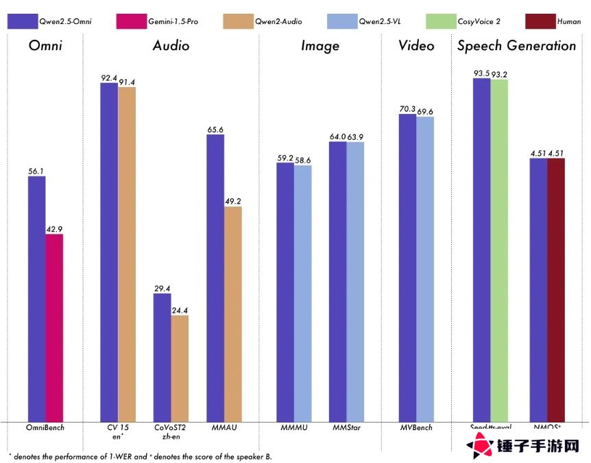 在多模态任务 OmniBench,Qwen2.5-Omni 达到了 SOTA 的表现。此外,在单模态任务中,Qwen2.5-Omni 在多个领域中表现优异,包括语音识别(Common Voice)、翻译(CoVoST2)、音频理解(MMAU)、图像推理(MMMU、MMStar)、视频理解(MVBench)以及语音生成(Seed-tts-eval 和主观自然听感)。