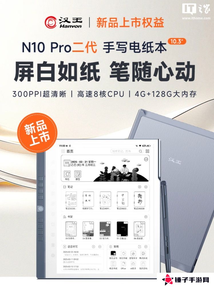 汉王 N10 Pro 二代电纸书上架:10.3 英寸 300 PPI 黑白墨水屏、标配手写笔,3089 元