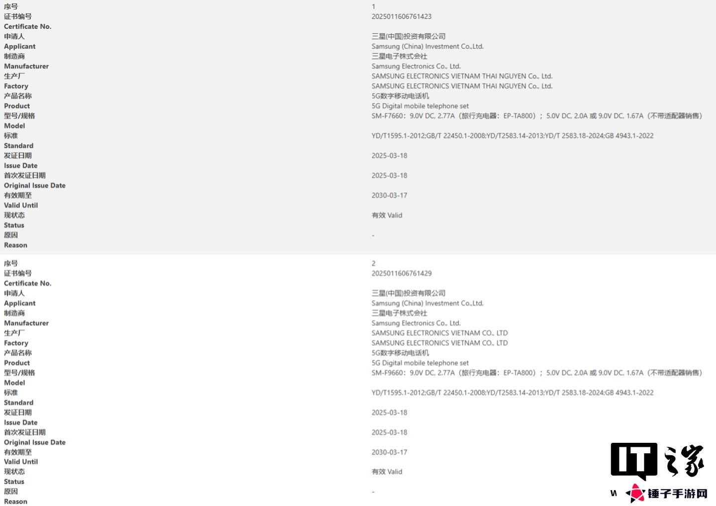 目前,三星 Galaxy Z Fold7 大折叠手机和 Galaxy Flip7小折叠手机均已通过国家3C质量认证,型号分别为SM-F9660 / SM-F7660,两款手机均支持25W充电,不过相应机型的其他确凿规格尚未得到确认。