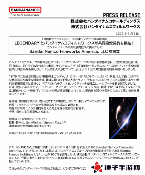 万代南梦宫影业已与传奇影业达成共同投资协议,将联手打造备受期待的《机动战士高达》系列好莱坞真人电影。这一合作标志着《机动战士高达》这一经典IP将首次以真人形式登上大银幕。