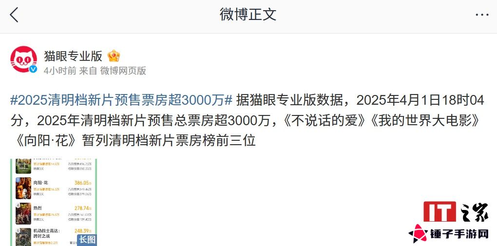 2025 清明档新片预售票房超 3000 万:《不说话的爱》《我的世界大电影》《向阳・花》位列前三