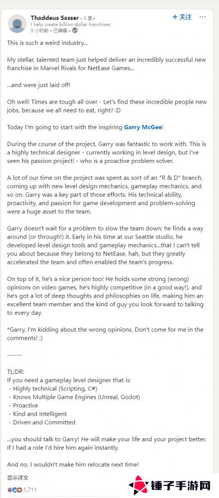 在这则动态中,Thaddeus Sasser称赞了他的团队在开发《漫威争锋》时的出色表现。对于团队被解雇的情况,他感到难以理解。Thaddeus Sasser曾向网易问询原因,但并未得到回应。不过,处于中国的开发团队未受影响。