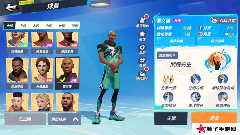 空手大师:移动速度额外增加并增加安全接球距离,且底线可以快速跑位。加速状态下,雷艾伦拿到进攻篮板、完成得分、篮下 3 公尺内成功抢到进攻地板球时加速技能将立刻完成冷却。