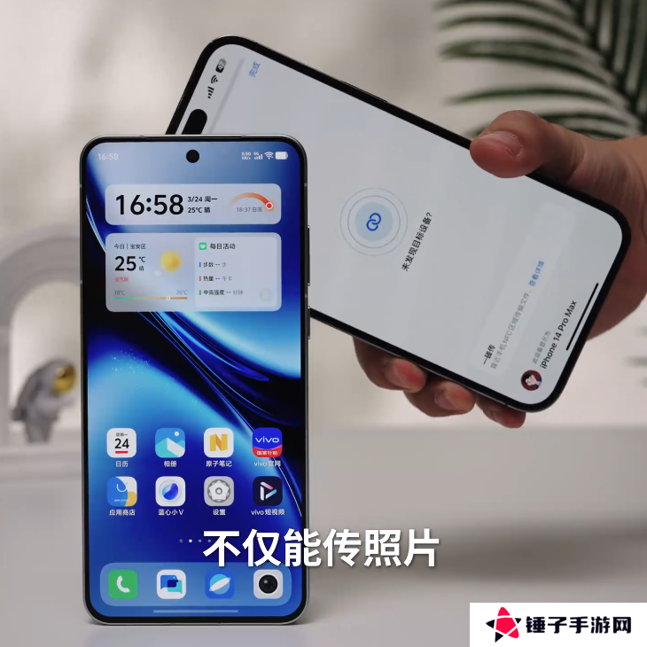 vivo X200s 手机还支持与 iPhone 碰一碰互传 LivePhoto 和文件,同时 iPhone 备忘录能够通过互传 App 分享给 X200s。视频还展示了 vivo X200s 手机的正面形象,其采用窄边框 + 居中单挖孔设计,(预计为视觉四等边设计:上左右三边等宽、下巴稍宽)。