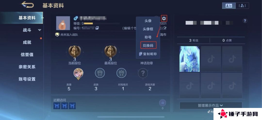 2、在个人主页中,点击服务器编号上方的小齿轮,选择兑换码;