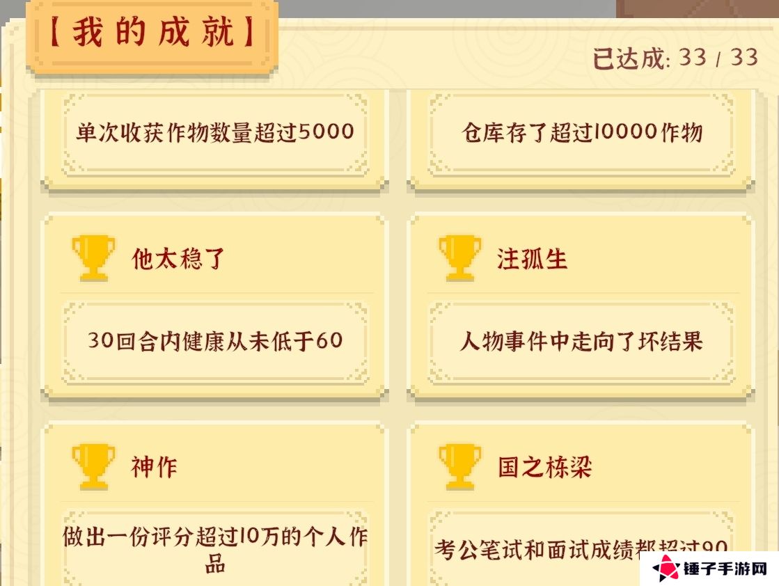 10、[隆平大弟子]和[屯屯鼠转世]可以一起做,反正一般开局走种田线比较赚钱,记住要有三块田后解锁大农田,租了大农田且升级了家乡旧宅和大农田仓库后才有足够的空间屯作物。而单位产出主要取决于工具和机械以及农才,工具在集市临时商人出买,机械在大农田处升级。