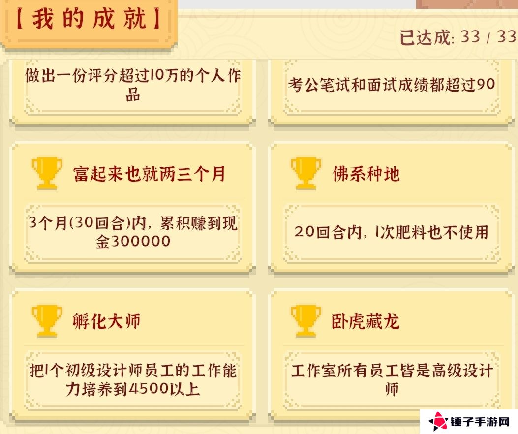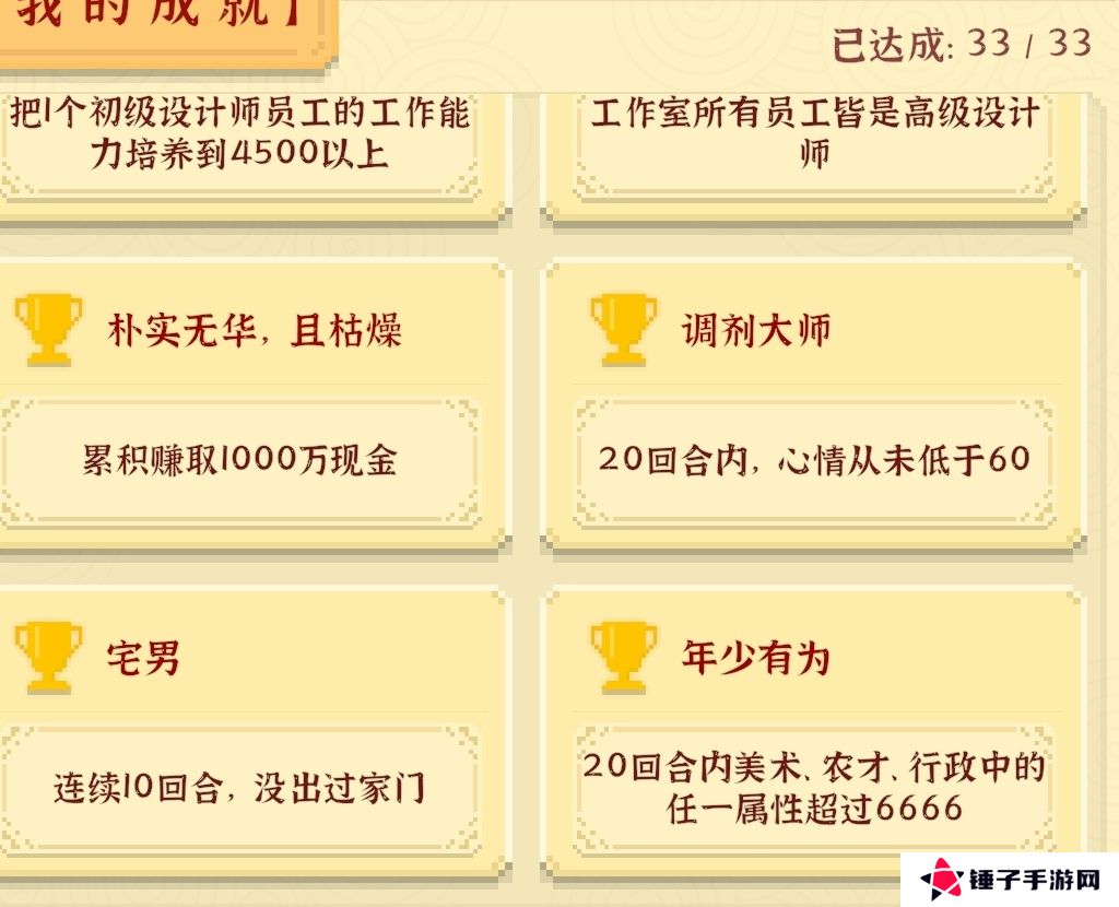 12、[孵化大师]和[卧虎藏龙]和[神作]可以一起做:前期主要提升美术然后创作大型个人项目,再不断改图就可以完成[神作],[孵化大师]和[卧虎藏龙]在创作线租写字楼之后按字面意思操作即可,先雇佣初级,知名度增加就雇佣中级,然后雇佣高级,留一个初级培训到完成任务就解雇,然后把高级招进来,记得要在集市家居商城买好提高员工能力的装饰,否则会累死。但开公司不建议用来赚钱,赚不了多少,还要花时间和精力,仅仅是为了达成成就才开公司。