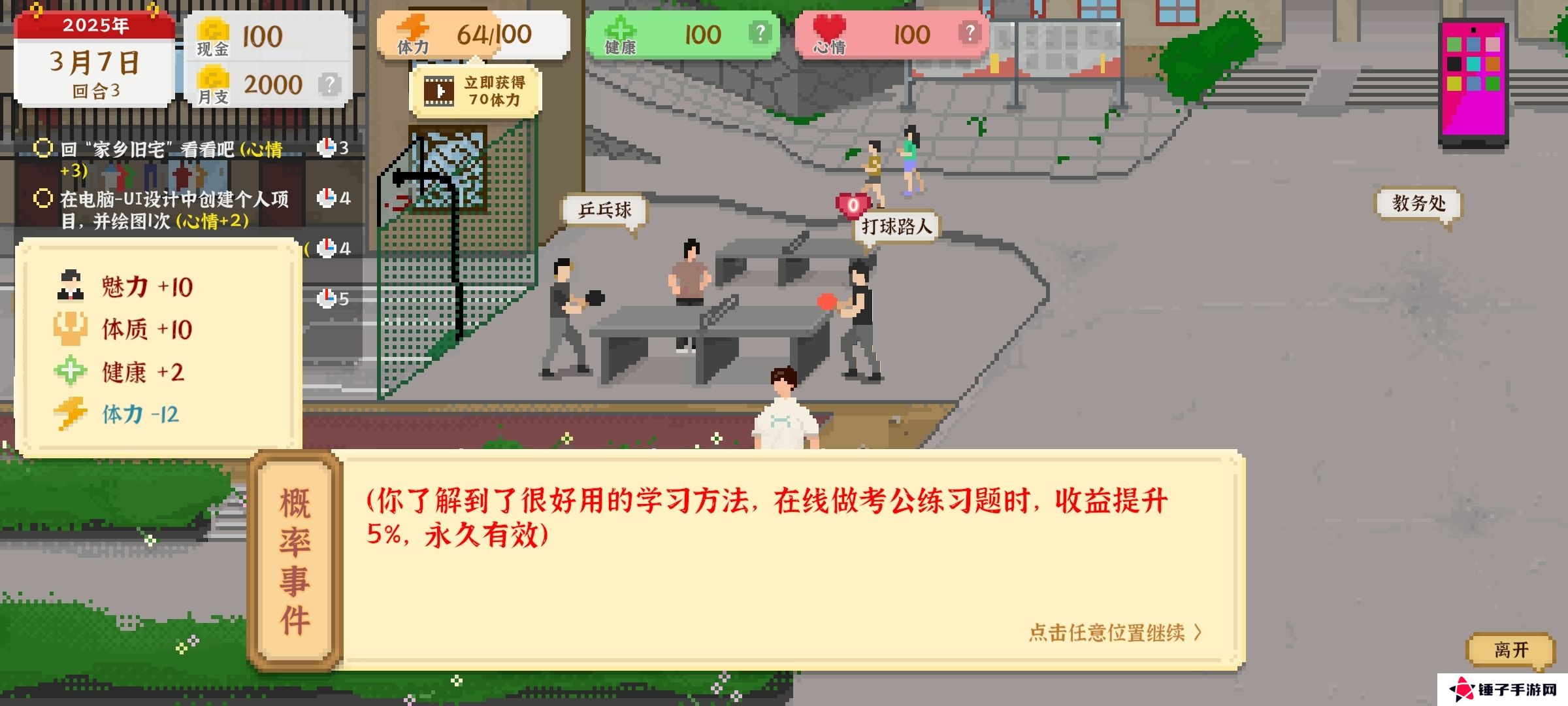 8、[打的不是乒乓球,是社交]:第三回合和老妈聊天后,解锁高级中学,前往和路人打乒乓球。