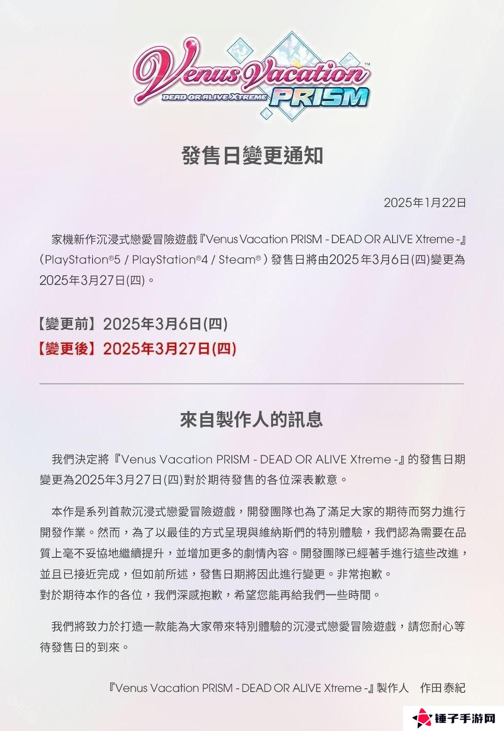 本作原定于今年 3 月 6 日上市,而今日稍早官方宣布将延期至 3 月 27 日,并对此表达歉意。声明中指出:「本作是该系列首款恋爱冒险游戏,我们一直在努力呈现令玩家满意的内容,而为了以最佳的方式呈现与维纳斯们的特别体验,我们需要毫不妥协地提高游戏品质并增加更多剧情。开发团队已着手进行,并已接近完成,但如前述,游戏发售日期将因此变更。我们对此深感抱歉,希望玩家能再耐心等待一段时间。我们将致力于打造一款身歷其境的浪漫冒险游戏,请耐心等待游戏发售日的到来。」