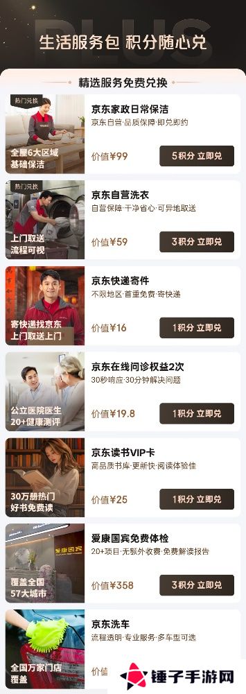 比如,京东 PLUS 会员用 3 积分可以免费兑换一次价值 358 元的体检服务,5 积分可以免费兑换一次价值 99 元的家政保洁服务(快递 1 积分)。