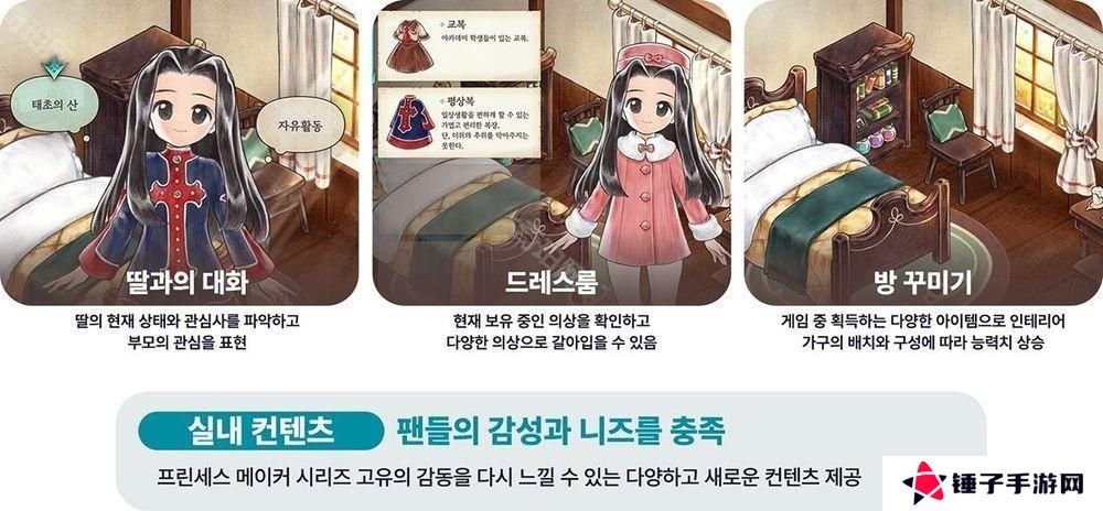 除此之外,系列玩家熟悉的「与女儿对话」系统、「服装换装」功能也将保留,并额外加入「房间装饰」系统,玩家可以佈置卡莲的房间,不仅具备装饰功能,更能影响她的能力值,使培养更加个人化,例如摆放书架可能提升学习效率,而摆放武器架则可能增犟她的战斗能力。