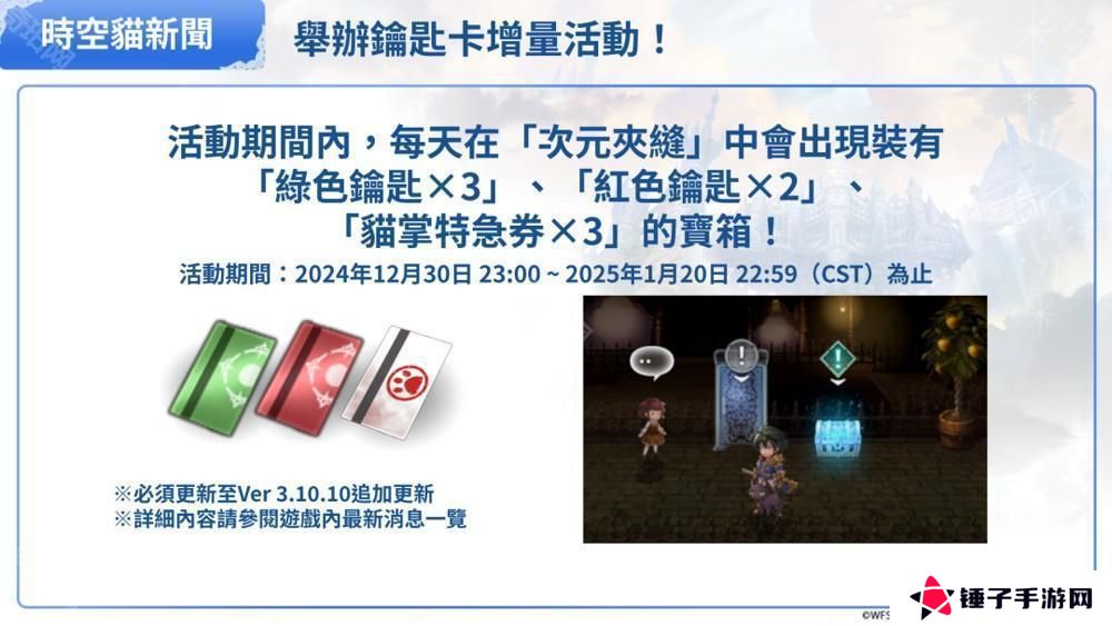 活动期间内,每天在「次元夹缝」中会出现装有「绿色钥匙 ×3」、「红色钥匙 ×2」、「猫掌特急券 ×3」的宝箱。