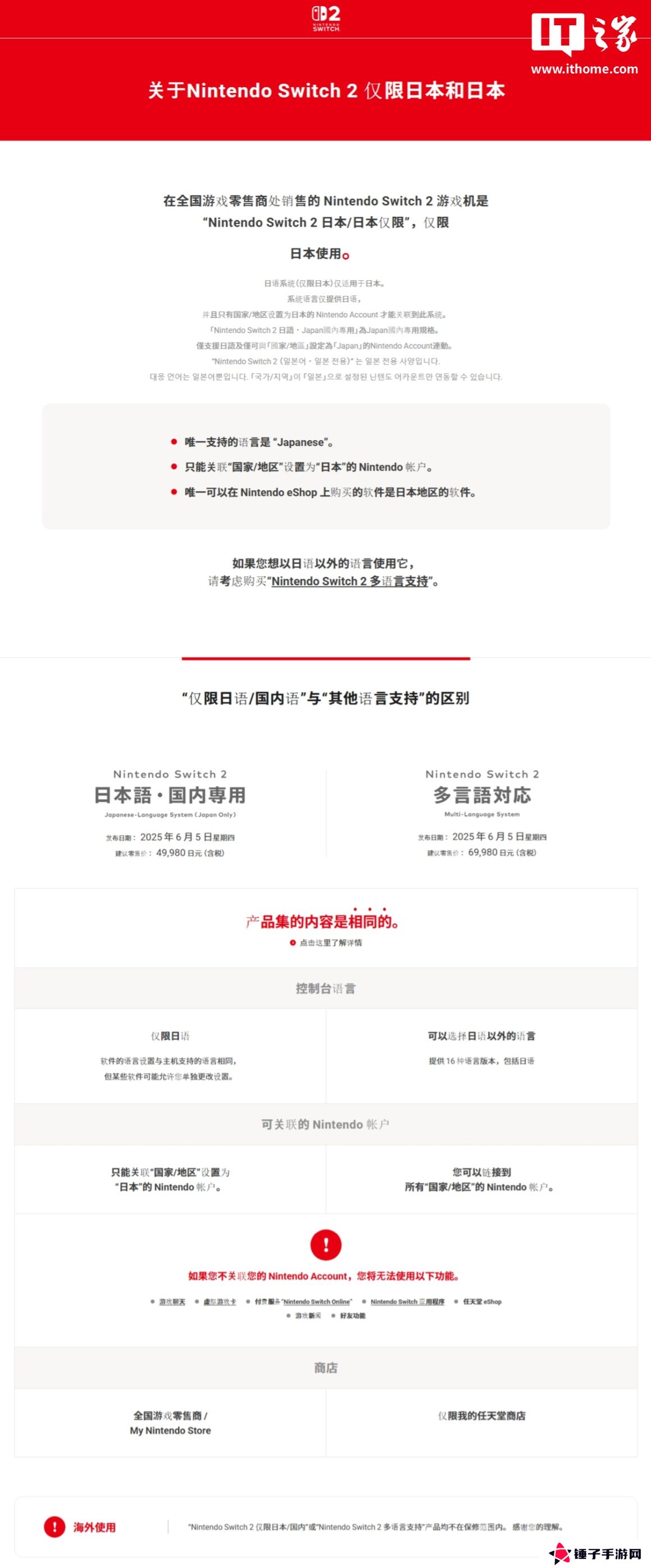 本站 4 月 2 日消息,任天堂今晚官宣 Switch 2 将推出“日本国内版”,该版本语言设定仅支持日语,同时仅可与「国家 / 地区」设定为「日本」的 Nintendo Account 联动。