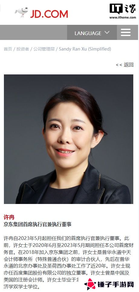 许冉于 1998 年毕业于北京大学信息管理专业(百度李彦宏学妹),毕业后在普华永道工作 20 年,后于 2018 年 7 月加入京东集团任财务副总裁,2020 年 1 月晋升为京东集团高级副总裁,6 月升任京东集团 CFO,2023 年 5 月起担任京东集团 CEO 兼执行董事。